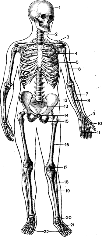 Кости содержат значительное количество солей кальция, фосфора, магния и других элементов, которые участвуют в минеральном обмене. В состав скелета входит более 200 костей, из них 33-34 непарные, остальные парные; 29 костей образуют череп, 26 - позвоночный столб, 25 костей составляют ребра и грудину, 64 кости образуют скелет верхних конечностей и 62- скелет нижних конечностей.