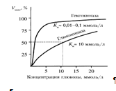 Гексокиназа обладает высоким сродством к глюкозе (Км <0,1 ммоль/л), поэтому максимум скорости реакции достигается при низкой концентрации глюкозы. Глюкозо-6-фосфат ингибирует гексокиназу. Глюкокиназа отличается от гексокиназы высоким значением Км для глюкозы – 10 ммоль/л и не ингибируется глюкозо-6-фосфатом. Это обеспечивает взаимное фунционирование обоих ферментов в печени. В постабсорбтивном состоянии концентрация глюкозы в крови низкая, около 5 ммоль/л и скорость глюкокиназной реакции примерно 1/5 от максимальной скорости. В таких условиях максимально работает гексокиназа. Во время пищеварения в воротную вену и далее в печень поступают большие количества глюкозы, и ее концентрация достигает и превышает 10 ммоль/л. Соответственно увеличивается скорость глюкокиназной реакции, причем если не происходит ингибирование гексокиназы глюкозо-6-фосфатом, то скорость гексокиназной реакции не падает. Что видно из графика: