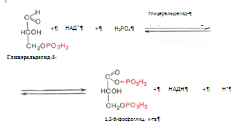 6. Глицеральдегид-3-фосфат в присутствии фермента глицеральдегидфосфатдегидрогеназы, кофермента НАД и неорганического фосфата продвергается своеобразному окислению с образованием 1,3-бифосфоглицериновой кислоты и восстановленой формы НАД – НАД*Н2 :