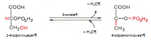 9. Реакция катализируется ферментом енолазой, 2-фосфоглицериновая кислота в результате отщепления молекулы воды переходит в фосфоенолпировиноградную кислоту (фосфоенолпируват), а фосфатная связь в положении 2 становится макроэргической: