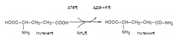 Один из путей связывания и обезвреживания аммиака в организме это биосинтез глутамина (и, возможно, аспарагина). Глутамин и аспарагин выделяются с мочой в небольшом количестве. Скорее они выполняют транспортную функцию переноса аммиака в нетоксичной форме. Синтеза глутамина, катализируется глутаминсинтетазой.