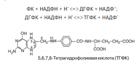 7. Фолиевая кислота с помощью витамина С восстанавливается в тетрагидрофолиевую кислоту (ТГФК) [8]; Восстановление сводится к разрыву двух двойных связей и присоединению четырех водородных атомов в положениях 5, 6, 7 и 8 с образованием тетрагидрофолиевой кислоты (ТГФК). Оно протекает в 2 стадии тканях при участии специфических ферментов, содержащих восстановленный НАДФ. Сначала при действии фолатредуктазы образуется дигидрофолиевая кислота (ДГФК), которая при участии второго фермента – дигидрофолатредуктазы – восстанавливается в ТГФК:
