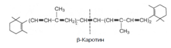 9. Часть каротинов преобразуется в витамин А под влиянием каротиндиоксигеназы. Каротины являются провитаминами для витамина А. Известны 3 типа каротинов: б-, в- и г-каротины, отличающиеся друг от друга химическим строением и биологической активностью. Наибольшей биологической активностью обладает в-каротин, поскольку он содержит два в-иононовых кольца и при распаде в организме из него образуются две молекулы витамина А: