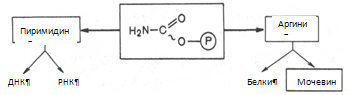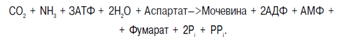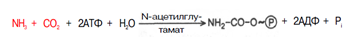 Весь цикл мочевинообразования может быть представлен следующим образом. На первом этапе синтезируется макроэргическое соединение карбамоилфосфат – метаболически активная форма аммиака, используемая в качестве исходного продукта для синтеза пиримидиновых нуклеотидов (соответственно ДНК и РНК) и аргинина (соответственно белка и мочевины):