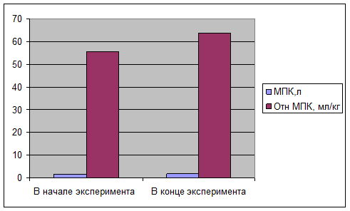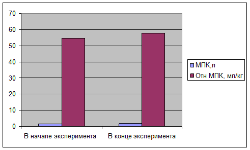 В следующей серии эксперимента пациентам проводилось исследование общей физической работоспособности. Для этих целей использовалась стандартная методика определение МПК степ тест по Астранду. Анализ полученных данных свидетельствует о том, что в начале эксперимента показатели физической работоспособности в обеих группах достоверно не различались, а в конце лечения в экспериментальной группе отмечается достоверное увеличение МПК на 210 мл или на 7,9%, а относительное МПК на 2 мл или на 5,8 %. В то время как в контрольной группе показатели физической работоспособности изменились недостоверно за время исследования (Таблица 7, 8).