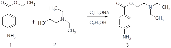 Варіантів синтезу новокаїну дуже багато, але найбільш зручним і простим методом синтезу є переетерифікация етилового ефіру п-амінобензойної кислоти (анестезину) з b-диетиламіноетанолом у присутності алкоголяту натрію (реакція алкоголіза) [6]:
