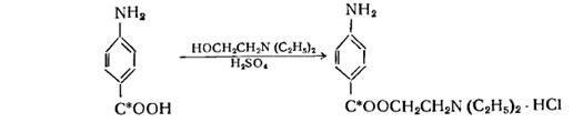 До охолодженого льодом розчину 1 г (7,3 моля) п-аміно-бензойної-С14 кислоти в 7 мл концентрованої сірчаної кислоти поволі додають 2,3 мл (19 молей) 2-диетиламіно-етанола. Суміш нагрівають із зворотним холодильником при температурі 85° протягом 7 годин., потім охолоджують до 0°, нейтралізують концентрованим розчином аміаку і кілька разів екстрагують ефіром. Об'єднані ефірні витяжки сушать над сульфатом натрію (протягом ночі) і висаджують продукт реакції, додаючи по краплях розчин сухого хлористого водню в ефірі. Вихід безбарвного кристалічного продукту складає 0,9 г (45%). Після двукратноїперекристалізації з абсолютного спирту і ефіру він плавиться при 155- 156°.