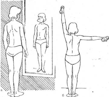 1 Исходная позиция, стоя перед зеркалом, сохраняя правильную осанку, поднять плечо с поворотом его внутрь на стороне вогнутости грудного сколиоза.
