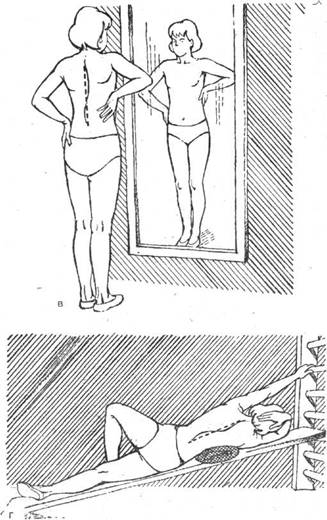 Попросите ребенка нагнуться и посмотрите сзади - не выпирает ли одна из лопаток и не формируется ли реберный горб. Если вы сомневаетесь (особенно при незначительной деформации), проверьте себя испытанным приемом - при помощи зеркала. В том же положении, что и в предыдущем пункте, рассматривайте ребенка в зеркале - деформация сразу станет заметной.