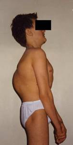 Формируется типичная поза больного, которая позволяет удержать туловище в вертикальном положении, но не предотвращает медленного прогрессирования грудного кифоза, который с возрастом и по мере завершения перестройки тел позвонков становится ригидным.