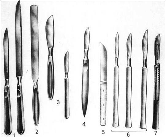 1 – малый и большой ампутационные ножи; 2 – мозговой нож; 3 – резекционные ножи; 4 – нож Эсмарха; 5 – нож для фаланг пальцев; 6 – остроконечные и брюшистые скальпели, 7 – брюшистый скальпель со съемным лезвием.