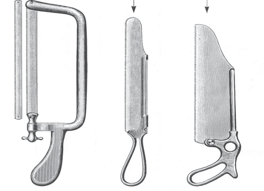 Пилы – применяются следующие виды – (рамочная) или дуговая пила; листовая пила, которую часто применяют для снятия гипса и проволочная пила Джигли. Ее применяют или с проводником Поленова или с ручками держалками.