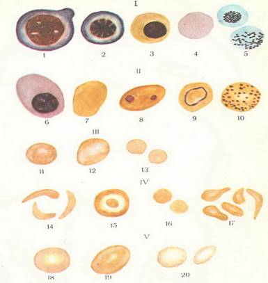 IV - пойкилоцитоз (эритроциты различной формы): 14 - в виде серпа (серповидноклеточная анемия); 15 - в виде мишени (талассемия); 16 - в форме шара (сфероцитарная анемия); 17 - различные другие формы эритроцитов;