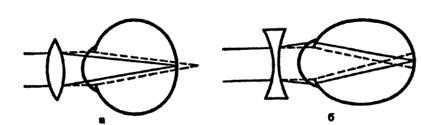 Рис. 1. Коррекция аметропии при гиперметропии (а) и миопии (б).