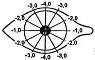 Коррекции требует также астигматизм глаза. Астигматизм может сопутствовать и эмметропии, и аметропии. Это бывает, когда преломляющие поверхности оптических сред (роговицы и хрусталика) имеют не сферическую, а эллиптическую или торическую форму. В этом случае в глазу сочетается как бы несколько рефракций: если посмотреть на астигматический глаз спереди и мысленно рассечь его плоскостями, проходящими через передний полюс роговицы и центр вращения, то окажется, что рефракция в таком глазу плавно изменяется от самой сильной в одном из сечений до самой слабой в другом сечении, перпендикулярном первому (рис. 2).
