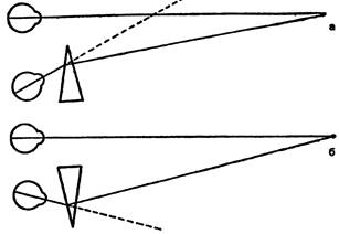 Рис. 3. Действия призм при сходящемся (а ) и расходящемся (б ) косоглазии.