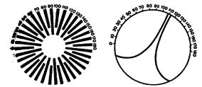 Лучистая фигура представляет собой круглое белое табло в виде циферблата диаметром 18—25 см, на котором через каждые 10—30° нанесены толстые черные лучи. Концы лучей обозначены цифрами. Лучистую фигуру показывают обследуемому с расстояния 5—6 м (рис. 4, а).