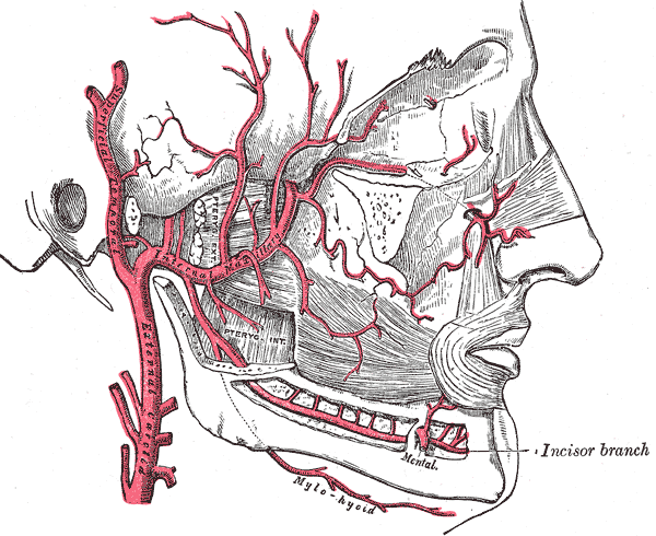 В пределах крыловидного отдела от верхнечелюстной артерии отходят ветви, питающие жевательные мышцы: 1) жевательная артерия, а. masseterica, к одноименной мышце; 2) височная глубокая [передняя ] и (височная задняя) артерии , а. temporalisprofunda (anterior) и (а. temporalisposterior), уходящие в толщу височной мышцы; 3) крыловидные ветви , rr. pterygoidei, к одноименным мышцам; 4) щечная артерия , а. buccalis, к щечной мышце и к слизистой оболочке щеки; 5) задняя верхняя альвеолярная артерия , а. alveolarissuperiorposterior, которая через одноименные отверстия в бугре верхней челюсти проникает в верхнечелюстную пазуху и кровоснабжает ее слизистую оболочку, а ее зубные ветви , rr. dentales,— зубы и десны верхней челюсти.