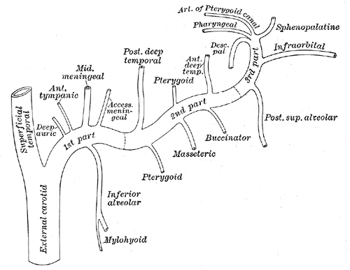 2. Верхнечелюстная артерия , а. maxillaris , — также конечная ветвь наружной сонной артерии, но более крупная, чем поверхностная височная артерия. Начальная часть артерии прикрыта с латеральной стороны ветвью нижней челюсти. Артерия доходит (на уровне латеральной крыловидной мышцы) до подвисочной и далее до крыловидно-небной ямки, где распадается на свои конечные ветви. Соответственно топографии верхнечелюстной артерии в ней выделяют три отдела: челюстной, крыловидный и крыловидно-небный.