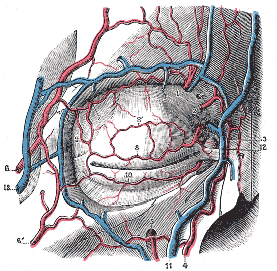 1 – надглазничная артерия и вена, 2 – артерия носа, 3 – угловая артерия (конечная ветвь лицевой артерии – 4), 5 – надглазничная артерия, 6 – передняя ветвь поверхностной височной артерии, 6’ – ветвь поперечной артерии лица, 7 – слезная артерия, 8 – верхняя артерия века , 9 – анастомозы верхней артерии века с поверхностной височной и слезной, 10 – нижняя артерия века, 11 – лицевая вена, 12 – угловая вена, 13 – ветвь поверхностной височной вены.