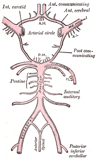 Задняя мозговая артерия , a. cerebriposterior, огибает ножку мозга, разветвляется на нижней поверхности височной и затылочной долей полушария большого мозга, отдает корковые и центральные ветви. В заднюю мозговую артерию впадает артерия communicans posterior (от внутренней сонной артерии), в результате чего образуется артериальный (виллизиев) круг большого мозга , circulusarteriosuscerebri.