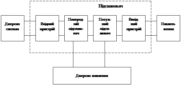 Керуюче джерело живлення, від якого сигнали, які потрібно підсилити, надходять на підсилювач, називають джерелом сигналу, а ланцюг підсилювача, в який ці сигнали вводять, - вхідним ланцюгом або входом підсилювача. Пристрій, який є споживачем підсилених сигналів, називають навантаженням підсилювача, а ланцюг підсилювача, до якого підключають навантаження, - вихідним ланцюгом або виходом підсилювача.