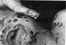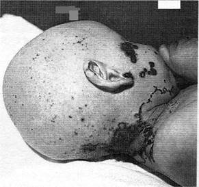 Рис. 148. Кандидозная инфекция. Поражение лица, шеи и волосистой части головы.