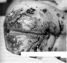Рис. 149. Кандидозная инфекция. Поражение лица, ягодичной области, кистей рук и стоп.