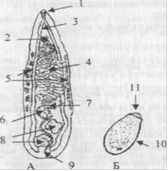Рис. 1. Марита (А) и яйцо (Б) кошачьего сосальщика (Opistorchis felineus). 1 - ротовая присоска: 2 - брюшная присоска; 3 - ветви кишечника; 4 - матка; 5 - желточники; 6 - семяприемник; 7 -яичник; 8 - семенники; 9 - выделительный канал; 10 - оболочка, 11 - крышечка.