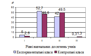 Порівняння результатів педагогічного експерименту в учнів 9 експериментальних та контрольних класів відображено на рис.2