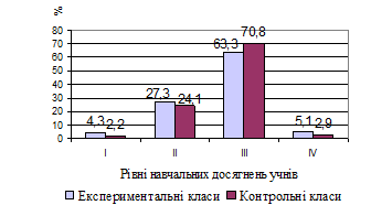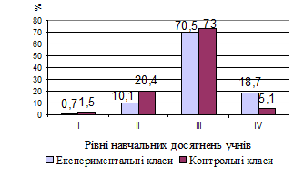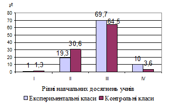 Детальний аналіз рівня навчальних досягнень учнів показав тенденцію зменшення кількості учнів з низьким і середнім рівнем і зростання кількості учнів з достатнім та високим рівнем навчальних досягнень в експериментальних класах.