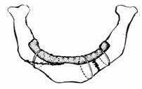 Оперативно-ортопедические способы лечения нижней челюсти. Одним из наиболее известных способов считается использование внешной лигатуры согласно J. Blak (1923). Суть данного метода содержится в проведении вокруг тела нижней челюсти проволочных лигатур, а также прикреплении их к надесневой покрышке (рис.2).