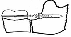 3. При беззубых челюстях спицу вводят в дистальный отломок, а над медиальным отломком, вокруг спицы сформировывают из быстротвердеющей пластика надесневой валик, который укрепляют к нижней челюсти круговыми проволочными лигатурами. K. Muschka (1973) при переломах угла нижней челюсти внес предложение держать венечный отросток или обратный край ветки нижней челюсти проволочной петлёй и укреплять ее концы на назубной покрышке. В.А. Сукачёв, Г.И. Осипов (1976) при подобных переломах вводили в ретромолярную область спицу с вырезкой на конце и прикрепляли ее к зубам нижней челюсти. Ю.Г. Кононенко, Г.П. Рузин (1991) для скрепления переломов угла употребляли компрессионно-дистракционное приспособление, брав за основу способ В.В. Донского (рис.4).