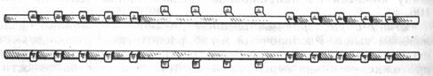 Наиболее распространённым средством ортопедического лечения считается метод назубного проволочного шинирования, предложенного С.С. Тигерштедтом во время 1 мировой войны. Гнутые покрышки из дюралевой, нихромовой либо ортодонтической проволоки (поперечным диаметром 0,8-1,5 мм) оснащают гладкими (одночелюстными) а также зацепными петлями (двучелюстными) для межчелюстной репозиции, а также иммобилизации отломков. Покрышки должны воссоздавать зубную дугу и граничить коронкой каждого зуба. Прикрепление покрышки к зубу осуществляется при помощи проволочных лигатур (поперечным диаметром 0,3-0,4 мм). Покрышку нужно укрепить к наибольшему количеству зубов, она не должна граничить с десневым краем, в избежание его травмирования. В настоящее время из покрышек Тигерштедта используют гладкую шину-скобу, покрышку с распорочным изгибом, а также покрышку с наклонной плоскостью. Показанием к использованию этих покрышек являются переломы нижней челюсти с отсутствием смещения либо просто репонируемые в пределах фронтальной группы зубов, переломы альвеолярных отростков; отсутствие групп зубов в зубном ряду. Но данный, отлично показавший себя способ не лишён недочетов; потому в будущем метод усовершенствовался разными авторами. Наиболее интересными, на наш взгляд, считаются предписания П.И. Попудренко, А.И. Степанова (1955, 1957), которые для облегчения назубного шинирования употребляли обычные зацепные крючки, с резиновыми кольцами, надеваемые на ровные одночелюстные покрышки. В.С. Васильев (1968) с целью упрощения способа назубного шинирования внес предложение использовать обычные ленточные покрышки с зацепными петлями из нержавеющей стали (рис.5).