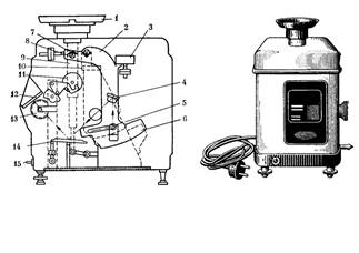 Терези складаються з наступних вузлів: знімної чашки (1), квадранта (2) із призмами (8), демпфера (3), стійки (10) з подушками (7), на які спирається призмами квадрант, підвіски (9) із трьома убудованими гирями (11) масою 100, 100, 200 г, механізму зняття гир з підвіски з рукояткою керування, виведеної на праву сторону ваг, оптичного пристрою, що складається з мікрооб'єктива, конденсатора, лампи підвіски, оптичної шкали і трьох дзеркал (4, 5 і 14), причому дзеркало 14 має регулювання по куту нахилу, кожуха, що закривається зверху кришкою, підстави ваг із трьома регульованими ніжками.