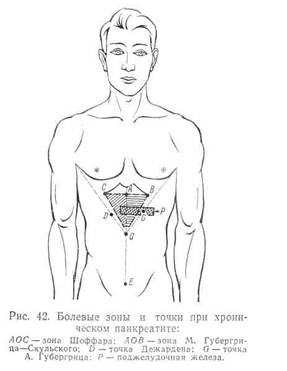 Железа увеличена в начальных стадиях обострения, в последующем при ее атрофии пальпация не дает отчетливых данных. Важное значение имеет наличие болевых зон: справа— зоны Шоффара (при поражении головки поджелудочной железы) и слева зоны М. Губергрица—Скульского (при поражении тела железы). Характерна также боль при надавливании в точке, находящейся на 6 см выше пупка на линии, соединяющей его с вершиной левой подмышечной ямки (точка А. Губергрица),— при поражении хвостового отдела железы и в симметрично расположенной ей точке справа (точка Дежардена) — при поражении головки (рис. 42).