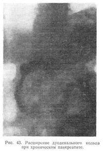 Рентгенологически прямые признаки заболевания (обызвествление поджелудочной железы, недостаточность сфинктера печеночно-поджелудочной ампулы, или сфинктера Одди) выявляются редко, значительно чаще отмечаются косвенные (стенозирование двенадцатиперстной кишки, нарушение ее перистальтики и развернутость ее дуги вследствие увеличения головки поджелудочной железы) (рис. 43). При рубцевании железы большой сосочек двенадцатиперстной кишки втягивается, и двенадцатиперстная кишка приобретает форму буквы Е. Все эти признаки лучше выявляются при дуоденографии в условиях искусственной гипотонии двенадцатиперстной кишки, вызванной внутривенным введением и мл 0,1 % раствора атропина сульфата и 10 мл 10 % раствора кальция хлорида. В редких случаях при дуоденографии, проводимой под компрессией, можно выявить рефлюкс контрастной массы из двенадцатиперстной кишки в проток поджелудочной железы. Существенную помощь оказывает эхографическое исследование.