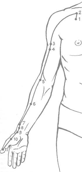 Точку определяют в положении сидя, ладонь кверху, при пальпации пульса тремя пальцами III палец врача ложится на эту точку.