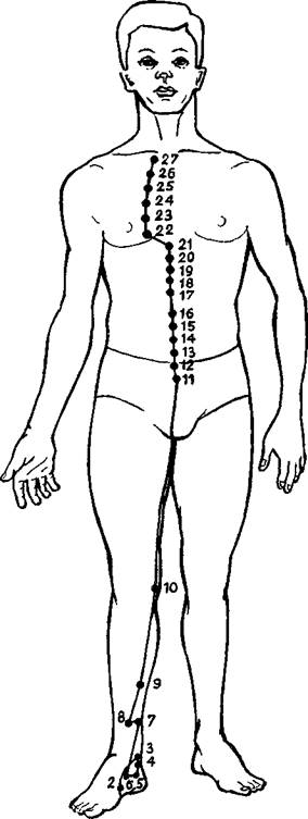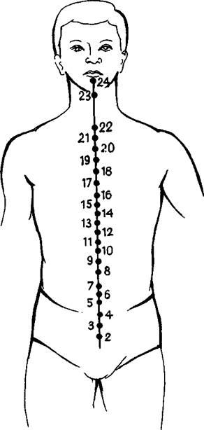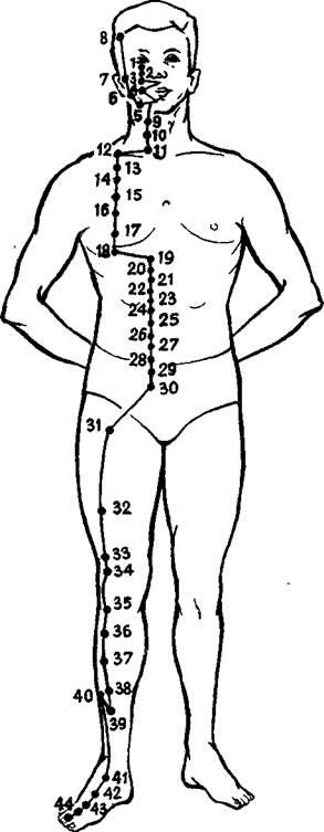 Переднесрединный меридиан не имеет так называемых стандартных точек, свойственных двенадцати постоянным меридианам.