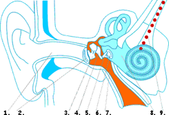 Звуковые колебания, продолжая свое движение от барабанной перепонки в среднее ухо, приводят в движение три тонкие косточки, также известные под названиями - молот, наковальня и стремечко (3, 4, 5). Эти косточки еще больше усиливают звуковые колебания прежде, чем передать их во внутреннее ухо.
