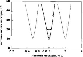 Кривые, построенные по результатам измерения остроты частотной настройки слуха методом маскировки. На кривой (в центре) показано, с какой интенсивностью должен звучать маскирующий сигнал для того, чтобы заглушить тестовый на частоте 1 кГц (отмечен звездочкой). Ширина кривой на некотором стандартном уровне - показатель остроты частотной настройки (отмечен стрелками). Полное исследование предполагает построение еще нескольких таких кривых при других частотах тестовых сигналов.