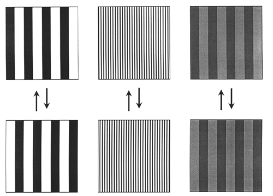 Но как установить, какую частоту решетки испытуемый различает, а какую - нет? Простейший способ - придать рисунку из темных и светлых полос вид узнаваемой фигуры, например буквы: если пациент сумеет правильно назвать букву, значит различает рисунок. Но такое упрощение идет в ущерб точности: в букве или картинке расстояние между полосами не может быть везде одинаковым, как в простой решетке. Есть, однако, изящный прием, позволяющий точно сказать, различает ли испытуемый решетчатый рисунок. Это проба на инверсию фазы решетки. Испытуемому показывают решетку определенной частоты, и в некоторый момент светлые и темные полосы этой решетки меняются местами (рис.2). Если рисунок решетки различим, то испытуемый увидит, что что-то сдвинулось, изменилось на экране. Если же полосы не различимы, то испытуемый в этот момент не заметит ничего: ведь за исключением положения полос, решетки до и после замены абсолютно одинаковы, так что серый фон, в который слились полоски, каким был, таким и останется. Итак: предельная частота решетки, при которой можно заметить инверсию ее фазы, - точная мера остроты зрения.