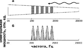 Тут нужно небольшое пояснение: применительно к спектральным решеткам мы использовали термин "плотность", тогда как для зрительных решеток мы говорили об их частоте. По сути это совершенно одно и то же, но дело в том, что применительно к звуку термин "частота" используется для обозначения частоты звуковых волн. Чтобы избежать путаницы, условимся для спектральных решеток использовать термин "плотность", считая, что эта величина тем выше, чем меньше частотный интервал между пиками (пики расположены плотнее).