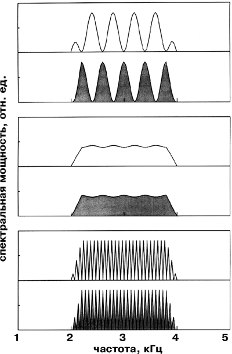 Но сразу возникает новый вопрос: одинакова ли разрешающая способность для разных участков частотного диапазона слуха, т.е. для звуков более низкой и более высокой тональности? Предложенный метод вполне позволяет это выяснить. Просто надо использовать сигналы с относительно узкими спектрами, центрированными на разных частотах; тогда полученные с их помощью результаты можно отнести к определенным диапазонам звуковых частот. Например, спектры, показанные на рис.4, сосредоточены вокруг частоты 2 кГц; а можно ведь использовать сигналы с похожими спектрами, но с любой другой центральной частотой - и более низкой, и более высокой. Сделали и это.
