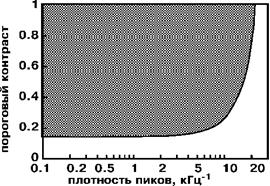 Все те сочетания плотности пиков и контраста, которые выше кривой (затененная область), доступны для различения; то, что ниже кривой, - за пределами возможностей слуха