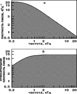 Рис.6 Кривые частотной разрешающей способности слуха, построенные в абсолютной шкале как число пиков на 1кГц частотного интервала (а) и в относительной мере - как отношение средней частоты к интервалу между пиками (б). Области под кривыми (затенены) отвечают различным рисункам спектра; выше - сливающимся в сплошной спектр.
