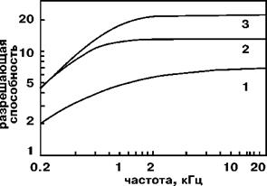 Рис.7 Частотная разрешающая способность слуха. Расчетная кривая (1) проходит примерно вдвое ниже кривой реальной разрешающей способности (2). Если же спектр сигнала имеет крутые края, то разрешающая способность - еще выше (3).