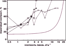 Все это стало возможным в течение последних лет благодаря выполнению проектов, поддержанных РФФИ. Наконец, впервые были получены данные о частотной разрешающей способности слуха. Если обратиться к результатам, их можно свести к нескольким простым графикам, но именно они характеризуют разрешающую способность нормального слуха. Один из них (рис.5) служит иллюстрацией того, как способность различать контраст между высотой пиков и глубиной провалов зависит от плотности пиков на частотной шкале, т.е. их числа в интервале частот 1 кГц. Если плотность спектральных пиков невелика, человек на слух способен различить спектральный рисунок с отклонениями по громкости от среднего уровня не менее 15-20%; менее контрастные спектральные рисунки слуху недоступны. Но и этот 15-20%-й порог доступен только при низкой плотности спектральной решетки - не более 10 пиков на 1 кГц интервала. По мере того как плотность решетки увеличивается, контрастный порог растет. Например, при плотности решетки 15 пиков на 1кГц спектральный рисунок будет различим только при контрасте перепадов высоты пиков не меньше 50%. А если плотность решетки увеличить до 20-25 пиков на 1кГц, то спектральный рисунок даже при 100%-м контрасте едва-едва различим. Дальше увеличивать контраст некуда; стало быть, 20-25 пиков на 1кГц - это предел частотной разрешающей способности слуха нормального человека. Более дробный спектральный рисунок не различается ни при каких иных параметрах сигнала: все сливается в сплошной, равномерный спектр.