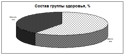 Базой исследования послужили начальные данные группы здоровья по состоянию на 1 сентября 2002 года. Эти данные свидетельствовали, что в группе общей численностью 15 человек, заболеваемость простудными заболеваниями достаточно высока, в частности дети проводили в болезни от 35 до 50% учебного времени. Состав группы здоровья и ее начальные характеристики по состоянию здоровья проиллюстрированы на диаграмме 2.1