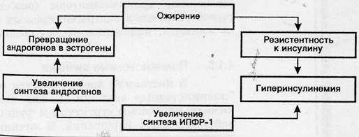 Известно, что при ожирении имеет место резистентность к инсулину, результатом которой является гиперинсулинемия. Тека клетки яичников имеют рецепторы к инсулину, кроме того, инсулин повышает образование Инсулиноподобного Фактора Роста – 1 (ИПФР-1), усиливающего синтез андрогенов в клетках тека и интерстициальной ткани яичников. Инсулин, кроме того, снижает уровень сексстероидсвязывающего глобулина и, следовательно, повышает уровень свободного, биологически активного тестостерона. Роль жировой ткани в метаболизме половых гормонов известна давно. В настоящее время доказано, что стромальные клетки жировой ткани обладают ароматазной активностью (содержат энзимы), способствующие превращению эстрогенов из андрогепов, а именно андростендиона в эстрон. Действие этих ферментов усиливается под влиянием инсулина и ИПФР-1, подобно тому, как это происходит в яичниках.